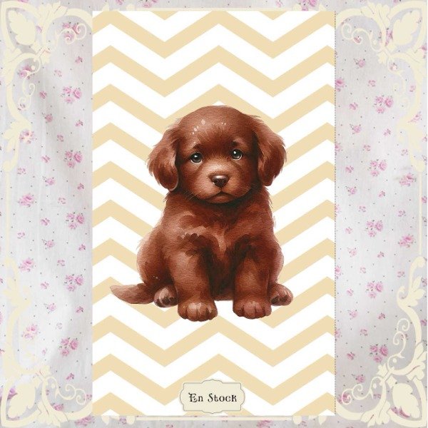 Imaginá que llegás cansadita y en la almohada te espera **Chocolatito**, con sus ojitos de miel derretida y el pelito más suave que un pan de chocolate recién horneado. El fondo en zig-zag dorado parece un rayito de sol que lo abraza, y si lo acariciás, jurarías que mueve la colita. Cada siesta será una tarde de galletitas y mimos eternos. 🐶🥐✨