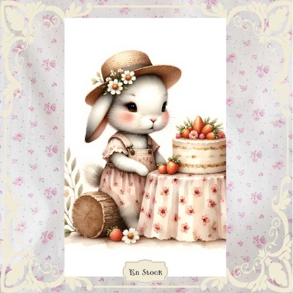 *Imagina una tarde de té en el bosque: una conejita con sombrero de margaritas decora su tarta con fresitas y zanahorias, mientras el aroma a vainilla llena el aire. Esta batista guarda esa dulzura en cada hilo, lista para una mantita de apego, un cojín de cuentos o un delantal de mini chef. 🧁✨💛*