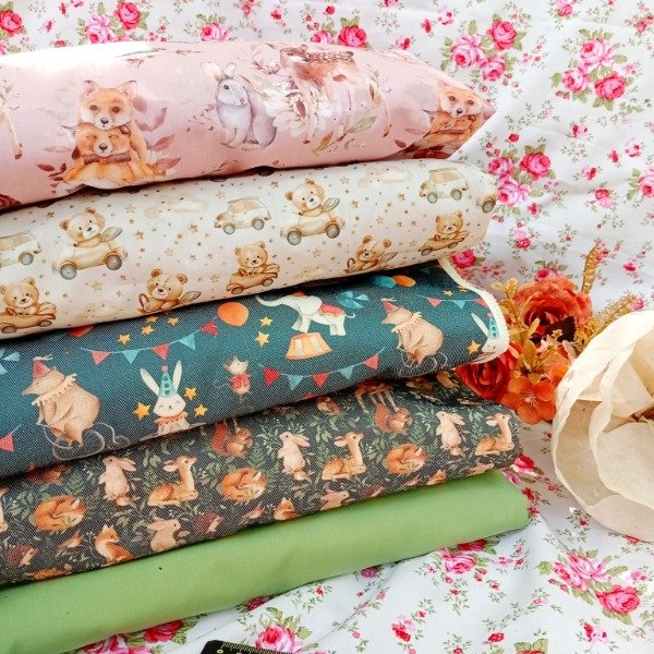 Imaginá un mundo tierno donde ositos, conejitos y elefantitos se dan la mano en una fiesta de globos y autitos de madera 🌿🧸. Una mantita suave que huele a bosque y a siesta calentita, con animalitos que miran con ojitos curiosos mientras tu bebé sueña aventuras. La batista ligera como pluma, la gabardina resistente como un abrazo fuerte… todo junto para crear cubos, mantas o almohadones que se roban el corazón al primer toque 🧵✨🐇💛.