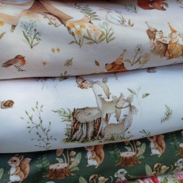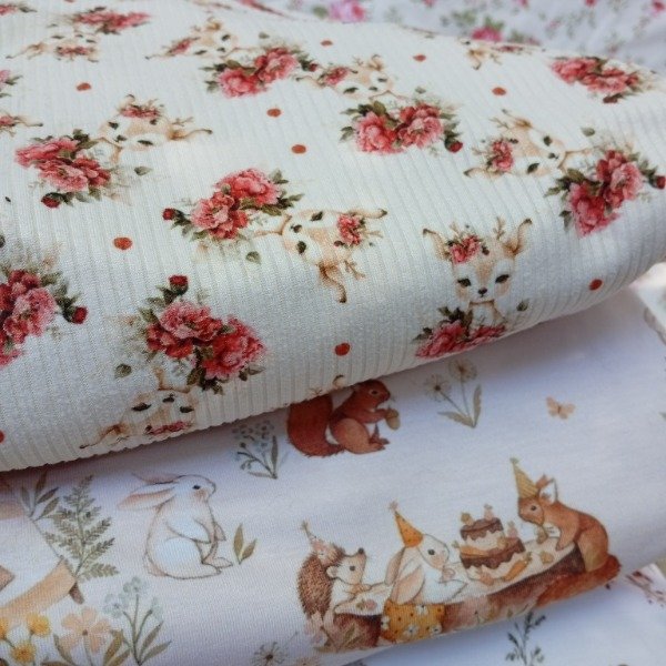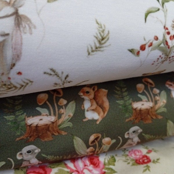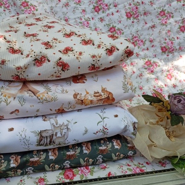 Podés hacer un conjuntito exquisito: el bolsillito estampado en la remerita o el body, la terminación en el gorrito y en el pantaloncito. Con estas cuatro telas armás un conjunto completo que parece de diseñador pero lo hiciste vos, con tus manos y tu intención. Y eso no tiene precio.