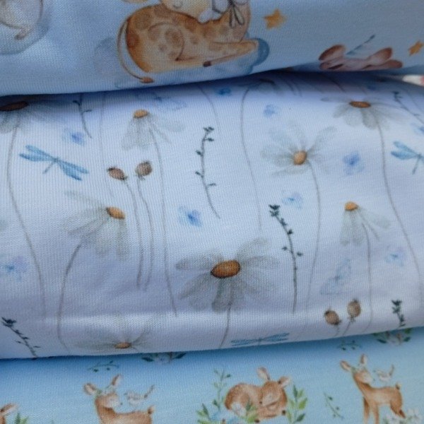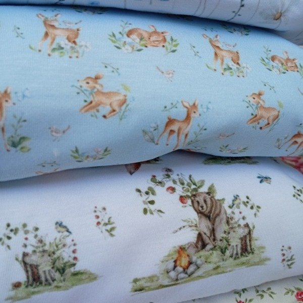 Podés hacer un conjuntito exquisito: el bolsillito estampado en la remerita o el body, la terminación en el gorrito y en el pantaloncito. Con estas cuatro telas armás un conjunto completo que parece de diseñador pero lo hiciste vos, con tus manos y tu intención. Y eso no tiene precio.