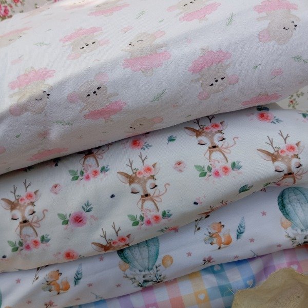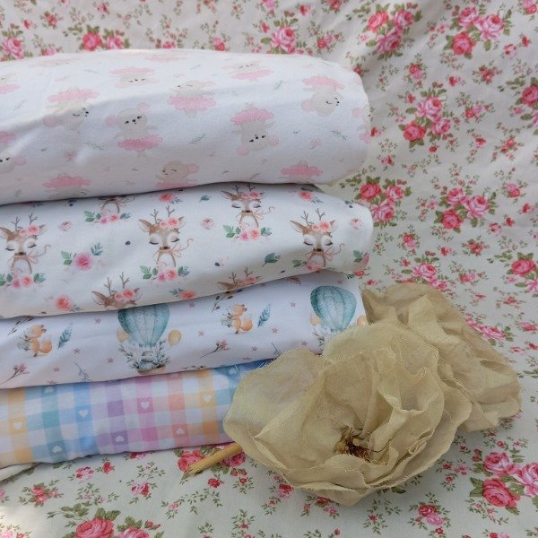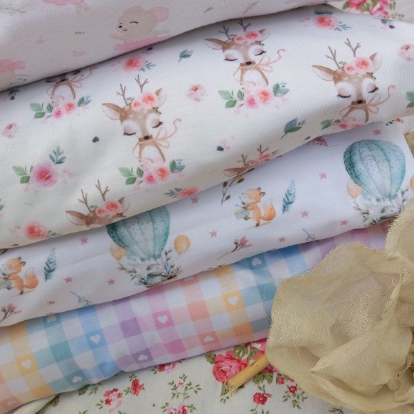Podés hacer un conjuntito exquisito: el bolsillito estampado en la remerita o el body, la terminación en el gorrito y en el pantaloncito. Con estas cuatro telas armás un conjunto completo que parece de diseñador pero lo hiciste vos, con tus manos y tu intención. Y eso no tiene precio.