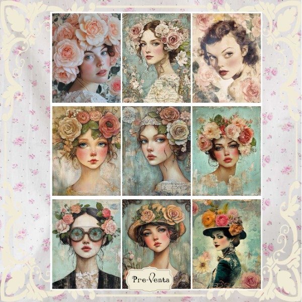 rostros delicados, miradas suaves y coronas de flores que parecen pintadas con un aire antiguo y un toque mágico.