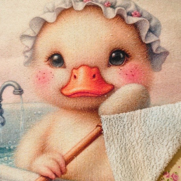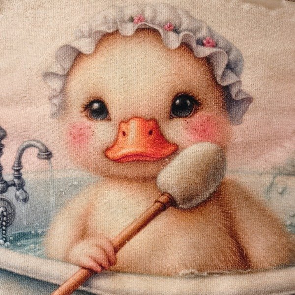 SEO description: Diseño pastel de patito en bañera con turbante y cepillito. Perfecto para deco bebé, toallas y accesorios. Disponible en múltiples telas.