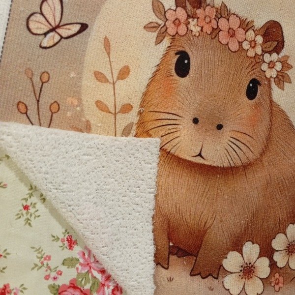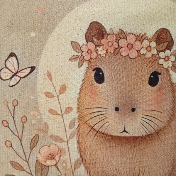 Una capybarita dulce y serena, rodeada de flores y con una coronita delicada que combina perfecto con los tonos cálidos del fondo. La mariposa que la acompaña y el círculo de luz atrás crean una escena tierna, suave y perfecta para proyectos infantiles o deco romántica.