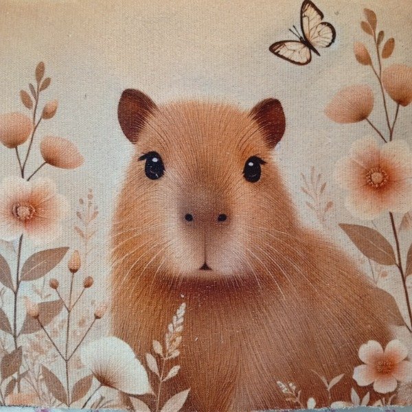 Hay diseños que nacen para ablandarte el corazón, y este frente de 35×35 cm es uno de esos. La capybarita, con su carita tierna y esa mirada calma, parece salir desde un rincón cálido del bosque para acompañar tus proyectos textiles.