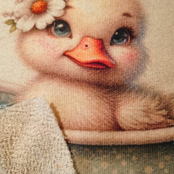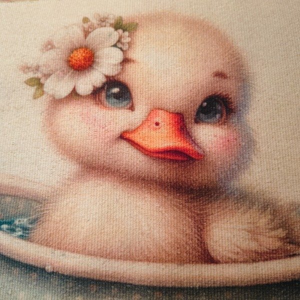 Panel infantil disponible en 35×35, 100×70, 145×100, 200×145 y 150×73. Patito bebé en bañerita vintage. Ideal para almohadones, toallitas y deco infantil. Producción: 7 días hábiles.