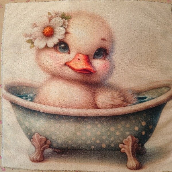 SEO description: Panel infantil con patito bebé en bañera vintage. Disponible en múltiples tamaños y telas. Perfecto para almohadones, toallitas y deco bebé.