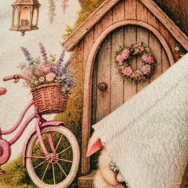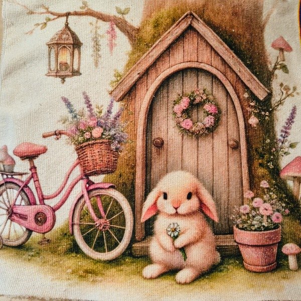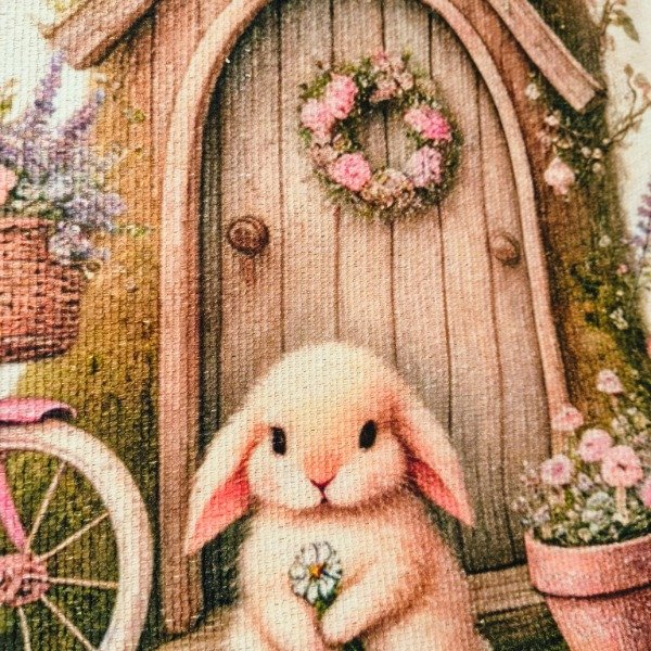 SEO description: Diseño tierno con conejito, casita en árbol y bicicleta rosa. Perfecto para deco infantil y proyectos textiles. Disponible en todas las telas.