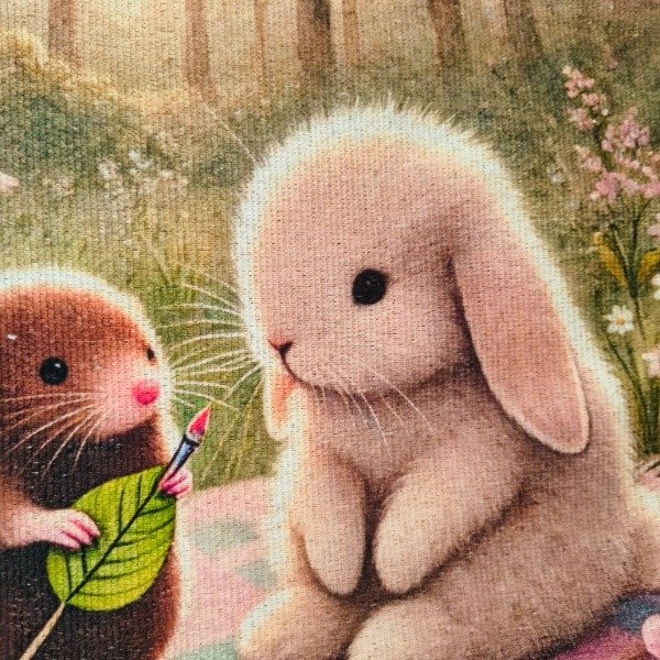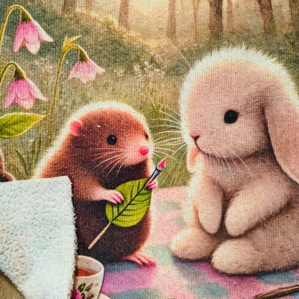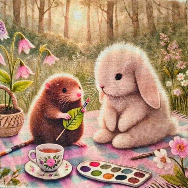 Bajo la luz suave del amanecer, este diseño captura ese momento mágico donde todo fluye sin prisa. Un conejito dulce y una ratita artista comparten una mañana de colores, té tibio y hojas que se vuelven pinceles. Es de esas escenas que te hacen sentir que crear también puede ser un mimo.