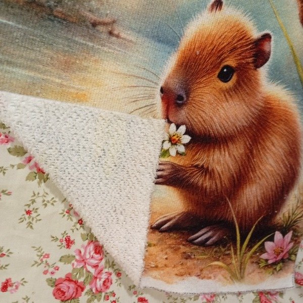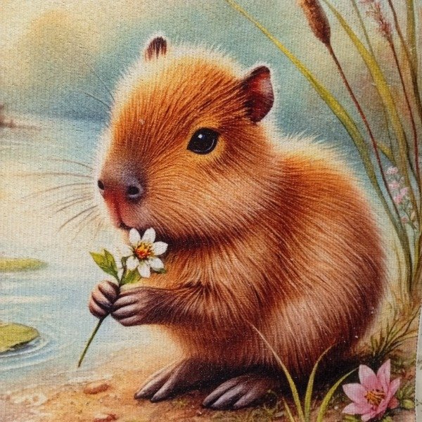 Una escena dulce y tranquila: la capybarita bebé sentada junto al lago, sosteniendo una margarita mientras los nenúfares flotan a su alrededor. Los colores cálidos y la luz suave crean un diseño tierno y perfecto para proyectos infantiles o deco natural.
