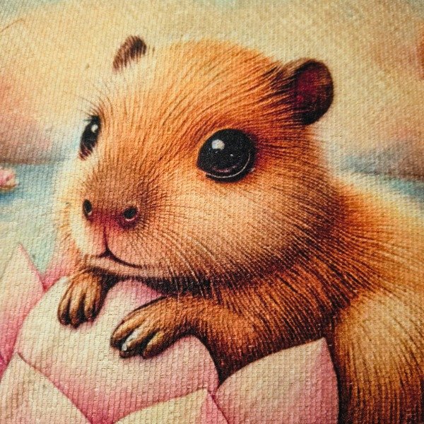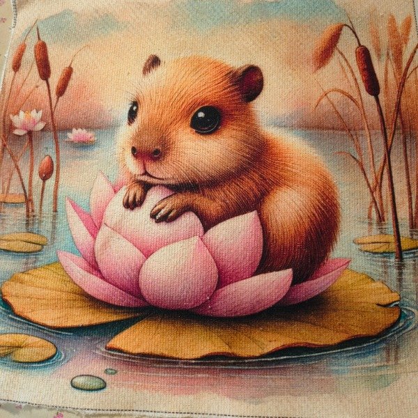 Esta capibarita bebé abrazada a una flor de loto es pura dulzura: suave, tierna, delicada.
