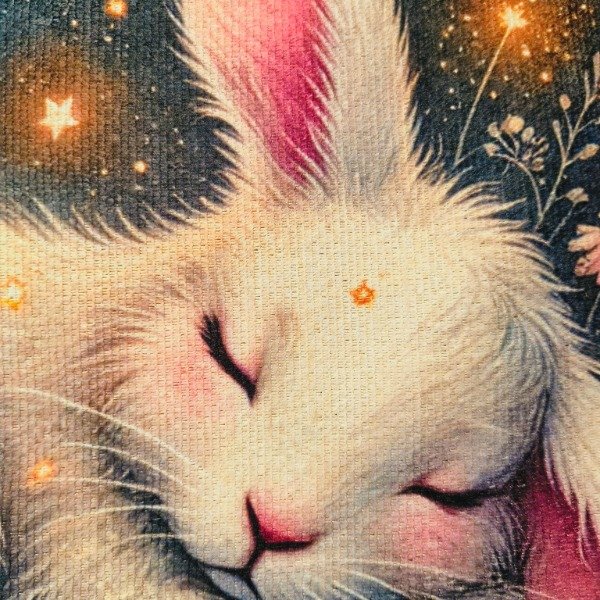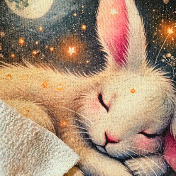 Conejito blanco soñando bajo la luna. Panel suave, colores tiernos, ideal para almohadones, mantitas y deco infantil. Preventa 7 días hábiles.