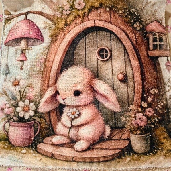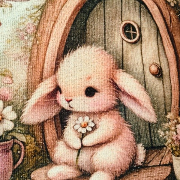 SEO description: Diseño cottage del conejito Nube en casita de tronco con flores pastel. Ideal para deco infantil y proyectos textiles.