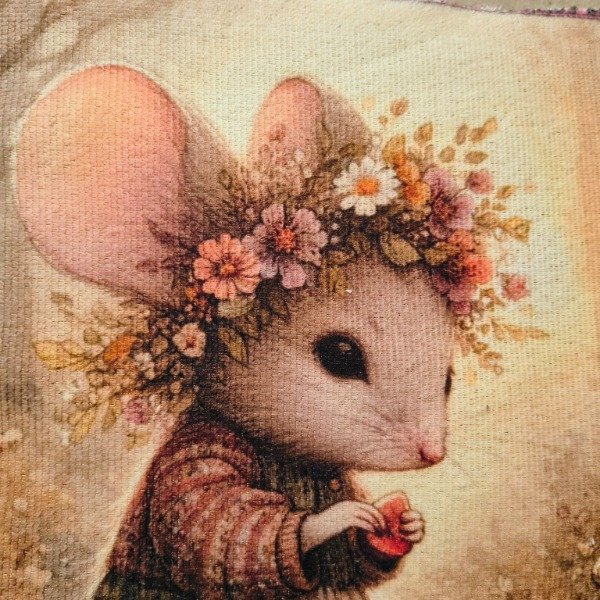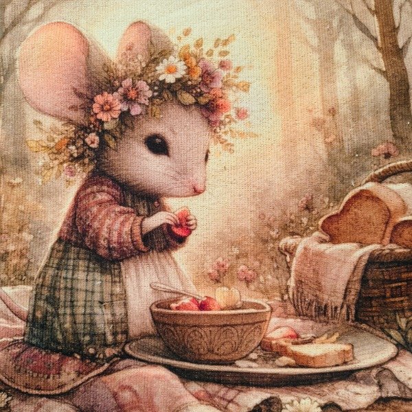 Una ratoncita dulce abraza a su pequeño compañero entre flores silvestres y un vestido hecho de retazos patchwork que cuentan historias. Su mirada tierna y la calidez de los tonos dan una sensación de abrazo suave y amor infantil.
