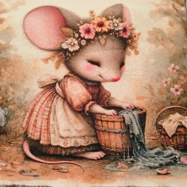 En un rinconcito dulce del bosque, una ratoncita vintage lava sus telas con calma y una sonrisa suave. Su coronita de flores, el vestido antiguo y el clima cálido alrededor crean una escena tierna, nostálgica y perfecta para proyectos infantiles. Es ese tipo de ilustración que transforma cualquier creación en algo mágico y lleno de amor.