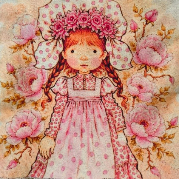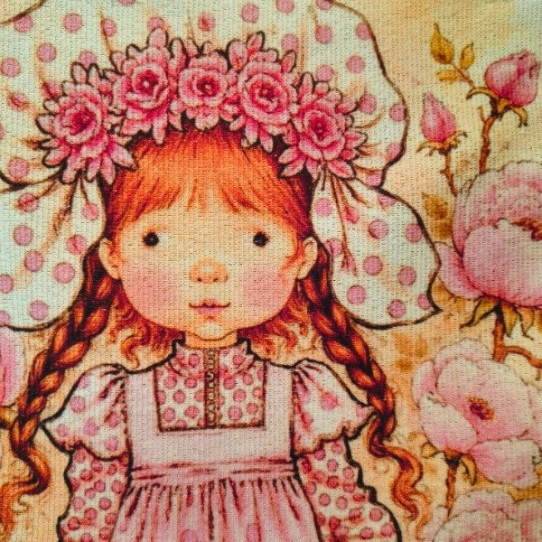 Este panel trae toda la magia dulce y nostálgica del estilo Sarah Kay: una niña de mejillas cálidas, vestidos con volados y mariposas que la rodean como si cuidaran sus pensamientos. Es una escena suave, de esas que llenan de paz cualquier proyecto textil y hacen que quien lo mire sonría sin darse cuenta.