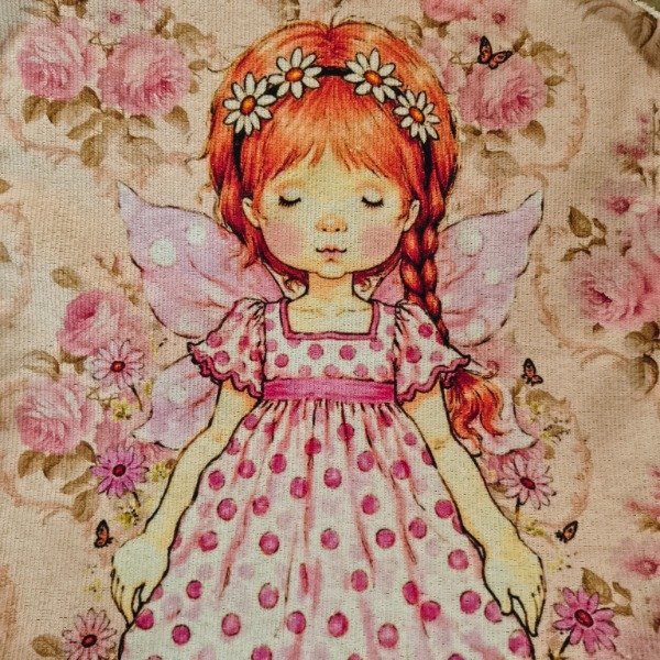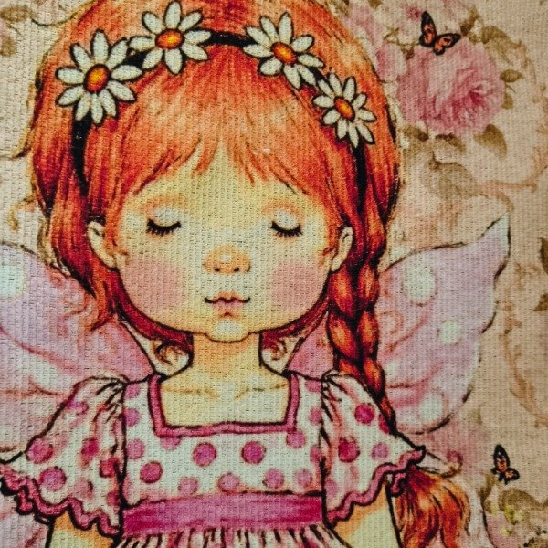 Este panel trae toda la magia dulce y nostálgica del estilo Sarah Kay: una niña de mejillas cálidas, vestidos con volados y mariposas que la rodean como si cuidaran sus pensamientos. Es una escena suave, de esas que llenan de paz cualquier proyecto textil y hacen que quien lo mire sonría sin darse cuenta.
