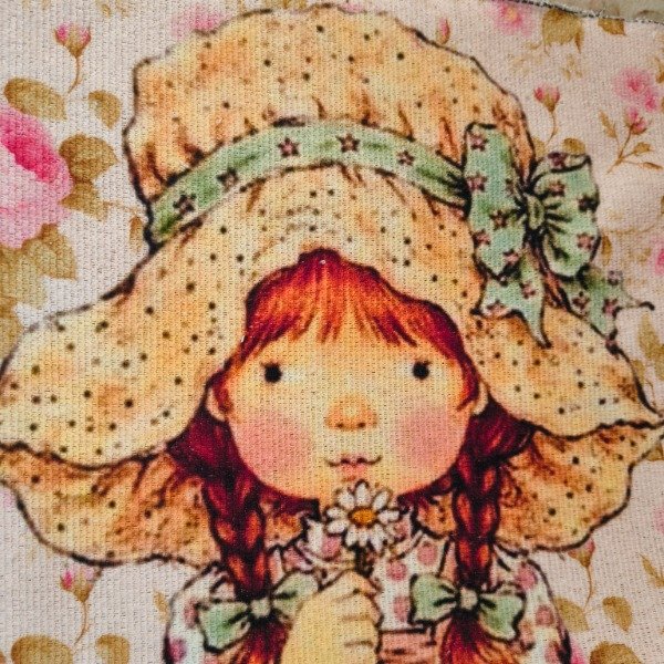 Este panel trae toda la magia dulce y nostálgica del estilo Sarah Kay: una niña de mejillas cálidas, vestidos con volados y mariposas que la rodean como si cuidaran sus pensamientos. Es una escena suave, de esas que llenan de paz cualquier proyecto textil y hacen que quien lo mire sonría sin darse cuenta.