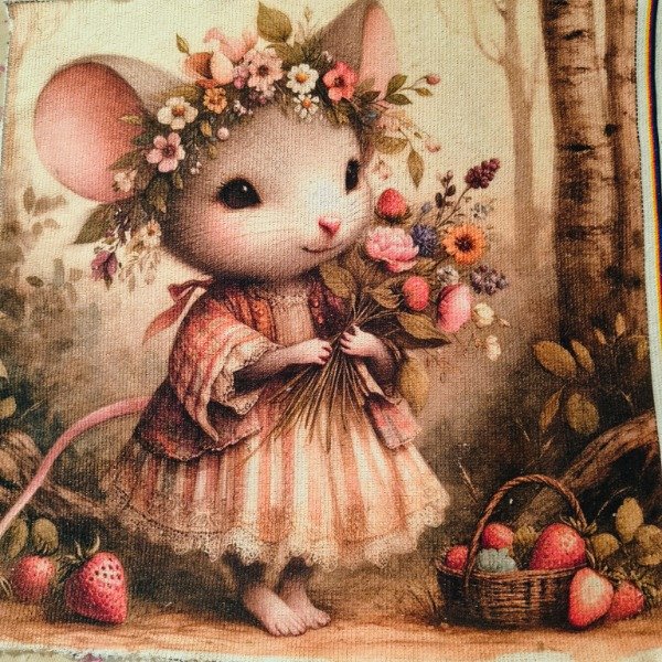 Tags: ratón, ratona, vintage, flores, frutillas, cottagecore, storybook, batista, gabardina, toalla.