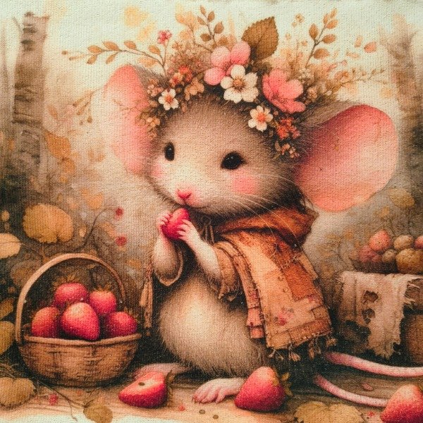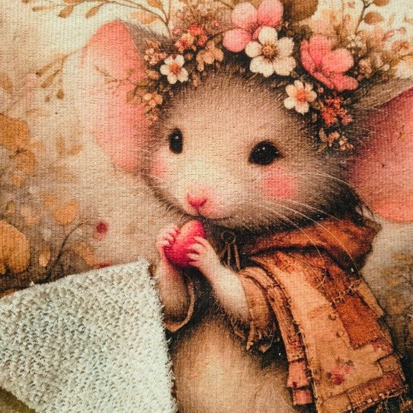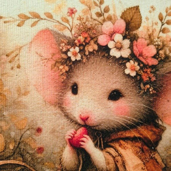 Una ratoncita dulce abraza a su pequeño compañero entre flores silvestres y un vestido hecho de retazos patchwork que cuentan historias. Su mirada tierna y la calidez de los tonos dan una sensación de abrazo suave y amor infantil.