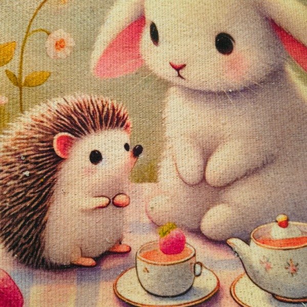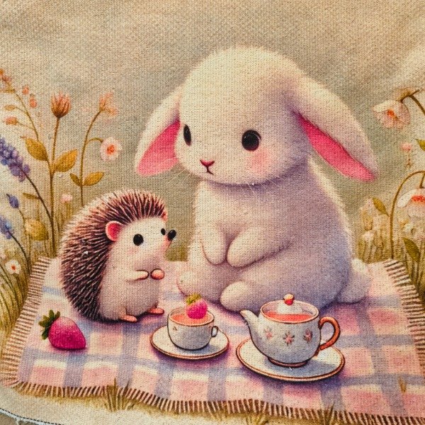 En un claro suave del bosque, una conejita esponjosa y un erizo adorable comparten una taza de té rosadito sobre una manta a cuadros. Entre frutillas, honguitos mágicos y vajilla dulce, esta escena transmite amistad, ternura y un momento de calma perfecto.
