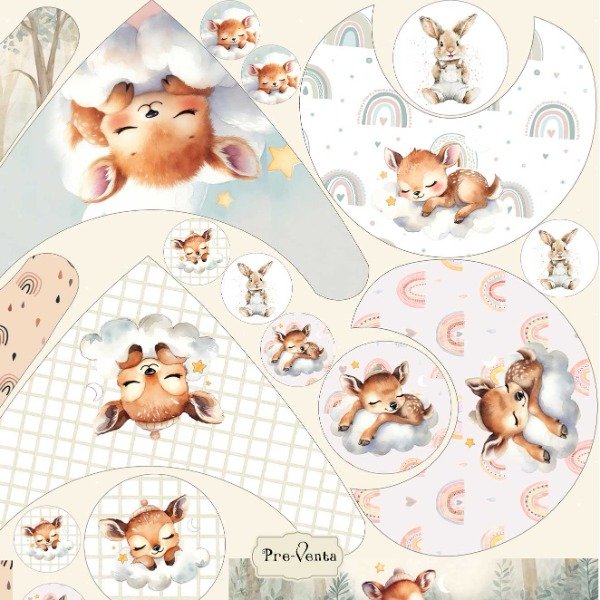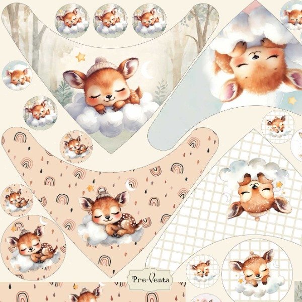 Imaginate abriendo este panel y viendo esos ciervitos de ojitos cerrados, durmiendo entre nubes suaves, arcoíris delicados y un bosque de pinos en miniatura. Cada babero es una escenita: ese pequeño ciervo que descansa en su nube celeste, las gotitas que caen mansitas, los arcoíris que parecen susurrar "todo va a estar bien". Son baberos que pedis que te los encargen: los que una mamá guarda para la foto, los que una abuela quiere bordar con el nombre, los que vos sabés que van a volver a tu taller convertidos en pedidos y más pedidos. 🌿💛