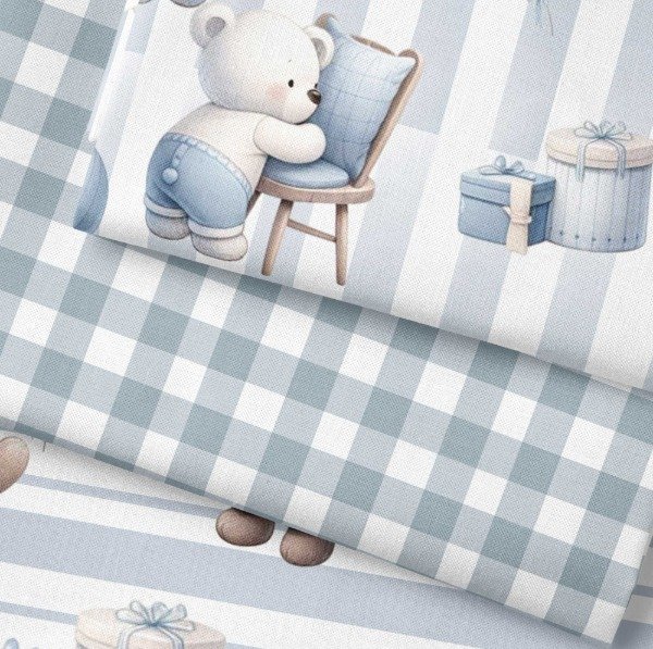 Ositos en tonos celestes y beige que parecen sacados de esos cuentos que te leía tu mamá antes de dormir. Ositos con jardineros. Sentados en sillitas de madera abrazando almohadones. Globos celestes que flotan suavecitos. Regalitos envueltos con moños. Rayas y cuadrillé vichy que te devuelven a la infancia.