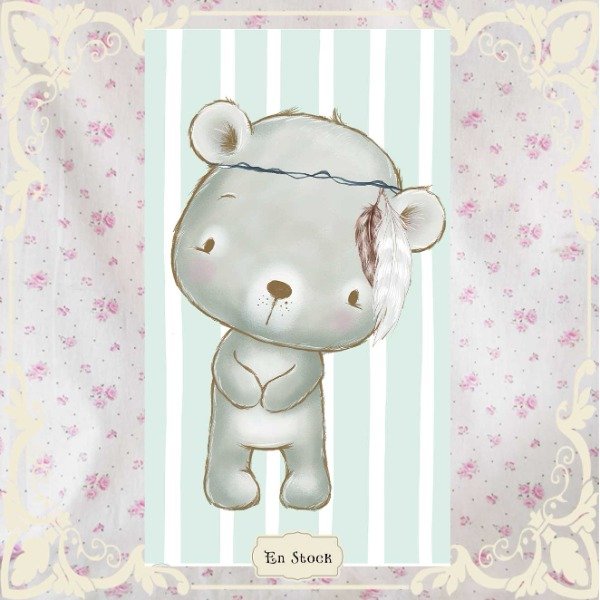 Imaginá la siesta más serena del bosque: una mantita de batista que envuelve como bruma suave, y en el centro, **Oso Nube** se para con sus patitas regordetas, coronado por una pluma blanca que danza como copo de nieve. Sus ojitos grises te miran con ternura infinita, mientras el rayado celeste susurra nanas de viento. Cada roce será un abrazo de algodón, perfecto para el colchón de un carrito o una almohada de mimos. 🐻🪶✨
