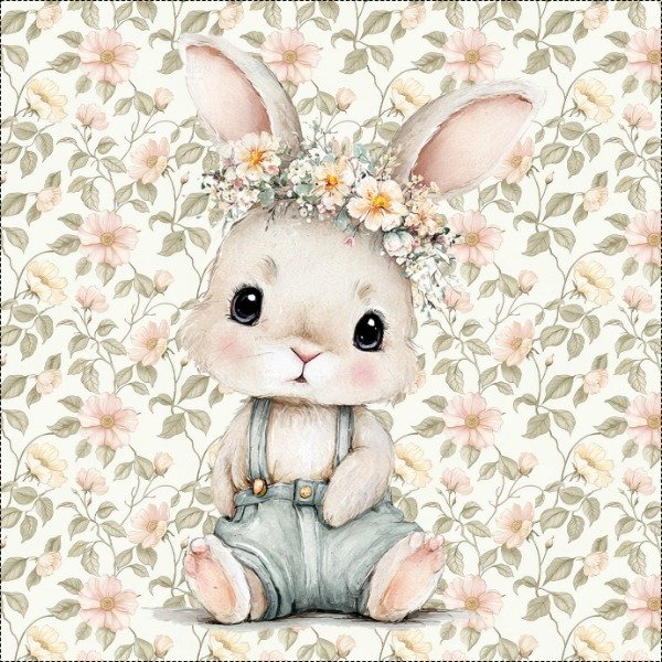 🌸 Este bebé conejito sentadito con su overol celeste es pura dulzura - rodeado de flores delicadas que parecen sacadas de un jardín secreto 🐰💕