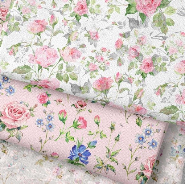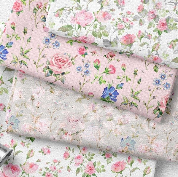 Rosas y flores silvestres en tonos suaves que parecen pintadas a mano. Rosa pálido, blanco, toques de azul y verde. Cuatro diseños que respiran primavera eterna y romance de jardín inglés.